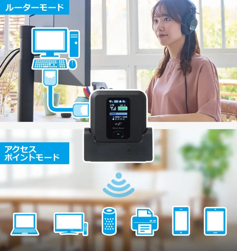 さらに、ブロードバンドルーターと接続しアクセスポイント(AP モード)として利用すれば、自宅の固定回線を無線化することもできます。