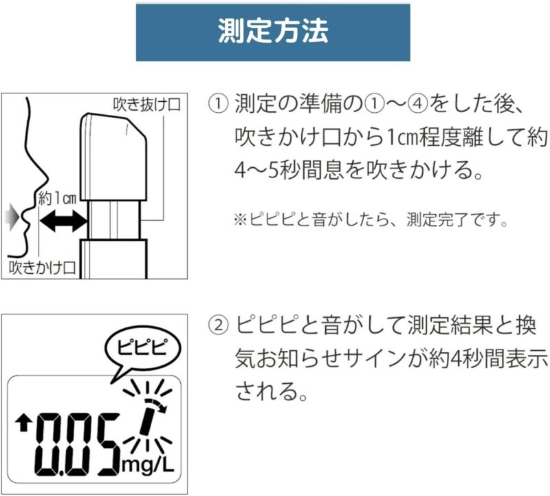 - 測定する: 口にセンサー部分を近づけ、息を吹きかけます。
