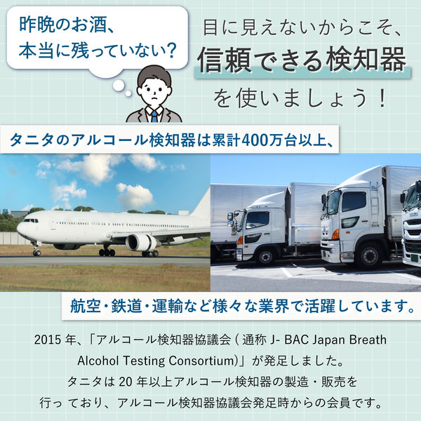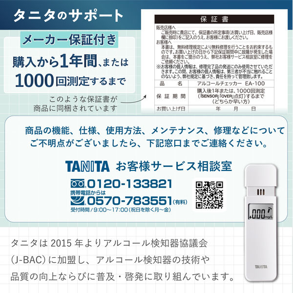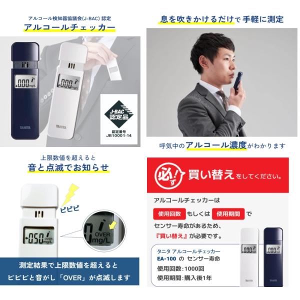 タニタのアルコールチェッカ「EA-100」は、コンパクトで使いやすい設計、そして高精度な測定が特徴の優れた製品です。飲酒後の確認や運転前の安心を提供してくれるため、家庭や職場での使用に最適です。
