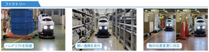 また、見やすい操作パネルと、ティーチング方式・マッピング方式の2つから選べるルート設定により、操作はシンプルです。クラウド経由での遠隔操作やルート修正にも対応しており、環境の変化にもすばやく対応できる設計となっています。