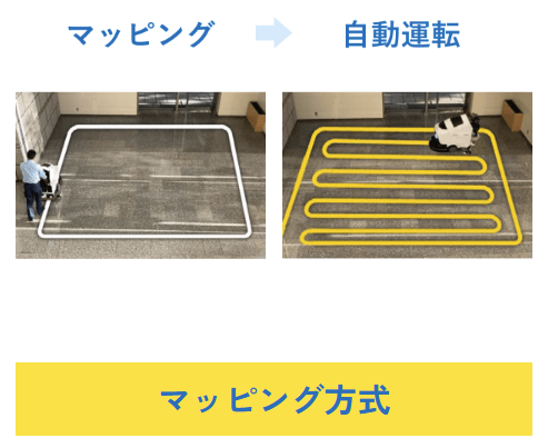 マッピング方式は、対象エリアの外周を囲むように走行すると内部の最適ルートを自動生成。障害物の少ない広域エリアに適します。