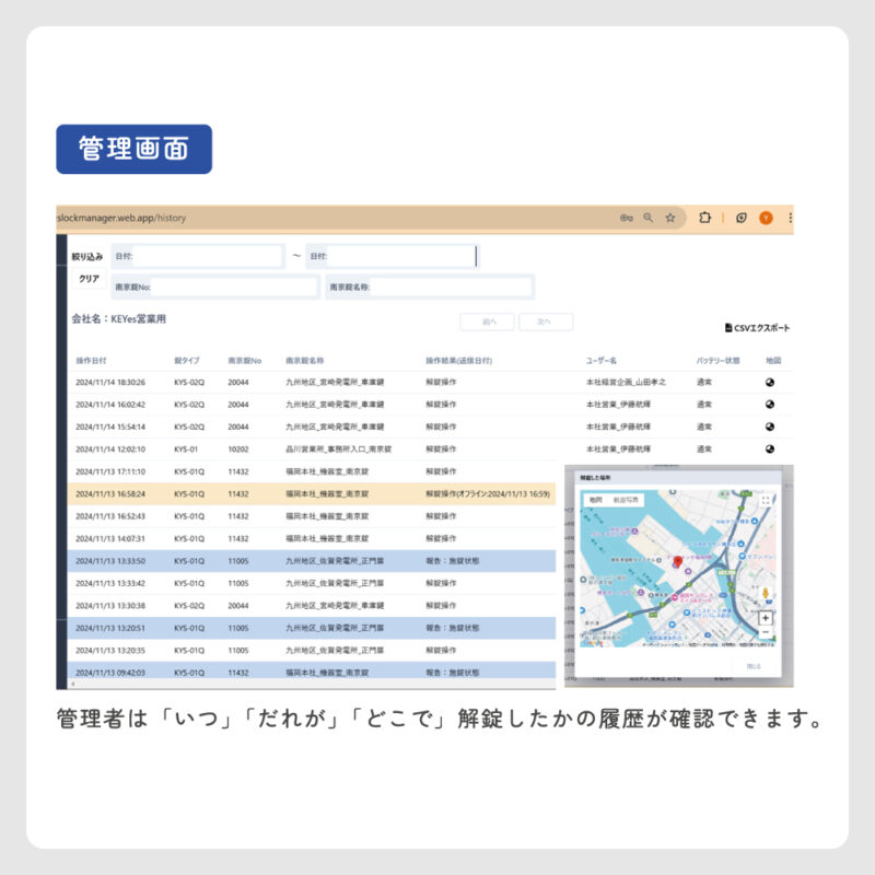 KYS-01は開錠時の情報を自動的に記録します。記憶や口頭報告に頼る必要がなく、客観的なデータとして履歴を確認できます。これはトラブル防止だけでなく、内部統制や監査対応の観点でも大きな強みとなります。