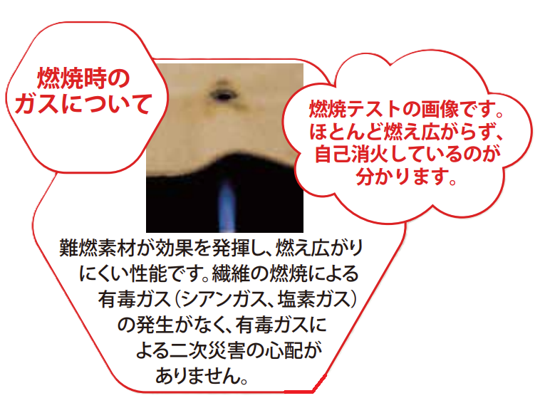燃焼時にシアンガスや塩素ガスなどの有毒ガスが発生しないため、二次災害の心配がありません。