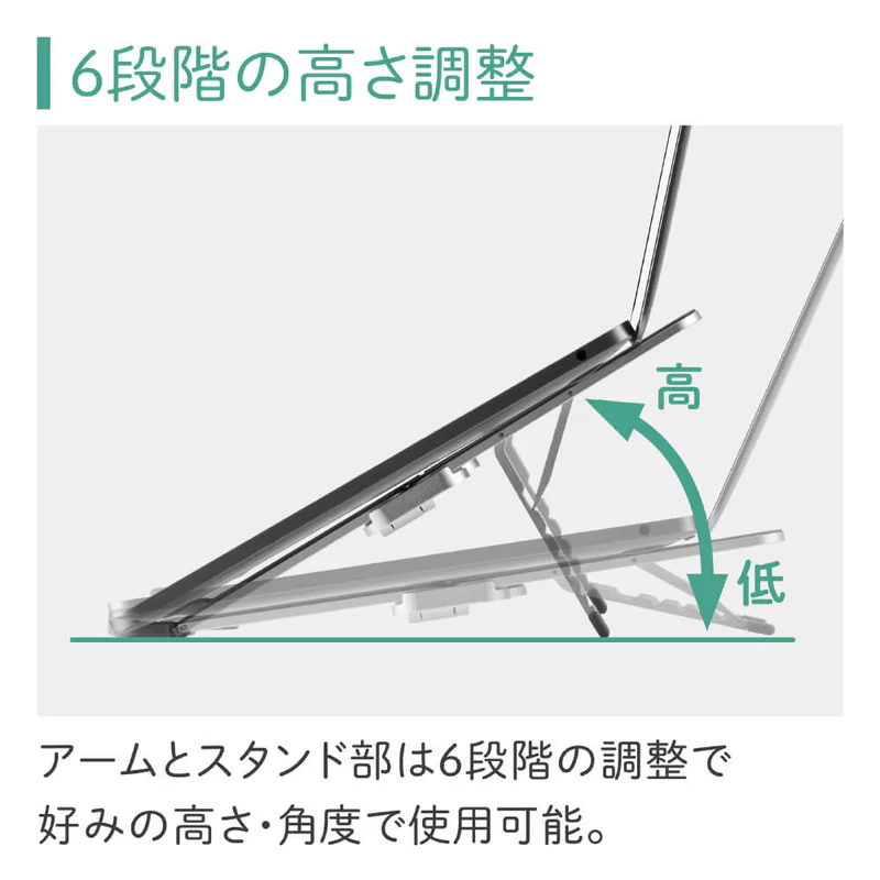 約190gの軽量・手のひらサイズで6段階の角度調整ができ、11〜15.6インチのノートPC/タブレットをしっかり支えるポータブル設計が魅力です。
