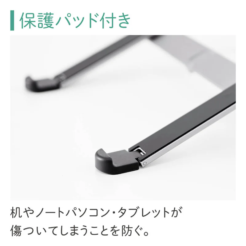 NPS30-SLは11〜15.6インチのノートパソコン/タブレットに対応。耐荷重は5kgで、一般的な13〜15インチクラスのノートパソコンや2-in-1も余裕をもって支えます。本体には滑り止めを兼ねた保護パッドを備えており、天板を傷つけにくく、端末がずれるのを防ぐなど、安心して使える設計です。
