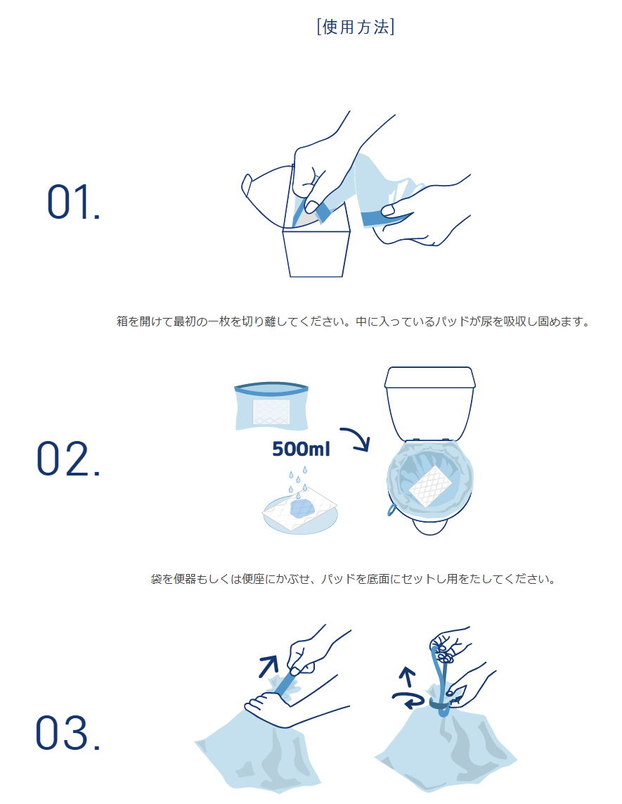 袋は便器や便座を覆うようにして使用でき、使用後は紐でしっかりと口を閉じることができます。尿は約500mLを目安に吸収でき、便についても衛生的に一次的に封じ込めることが可能です。廃棄の際は、各自治体の指示に従って処理してください。