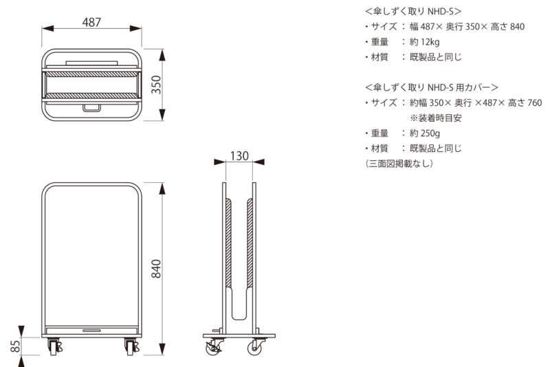 「傘しずく取り NHD-S」は、幅487mm×奥行350mm×高さ840mmというコンパクト設計で、限られたスペースにも設置可能です。